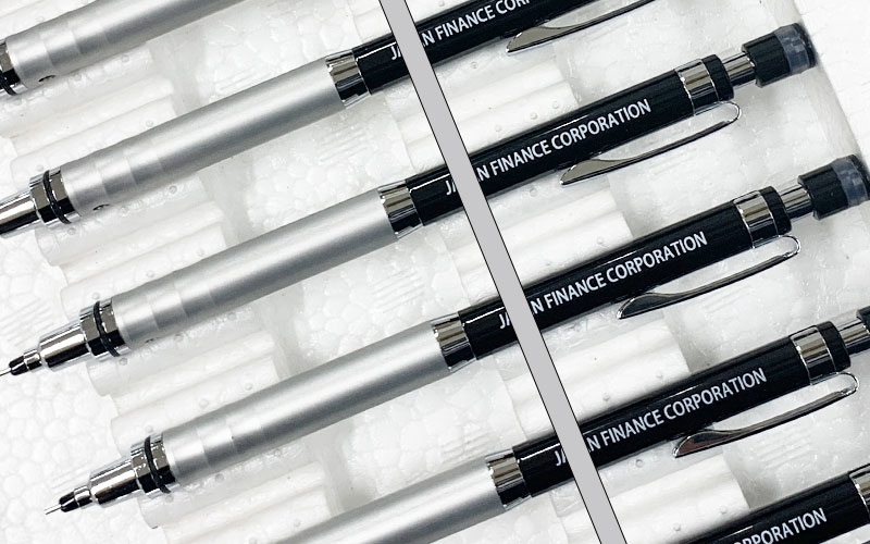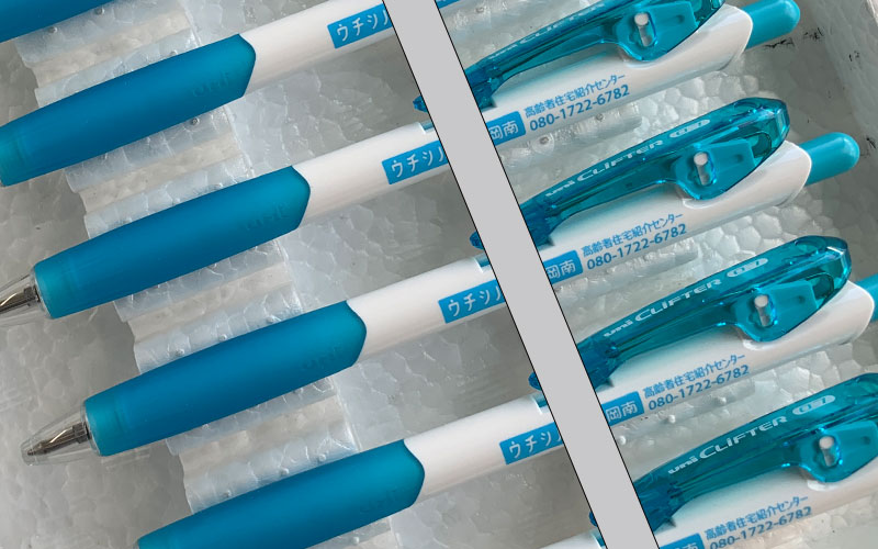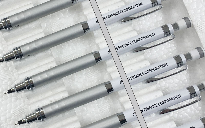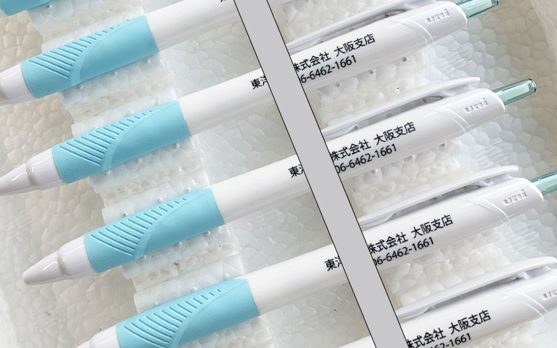 パッド印刷―三菱ジェットストリームの白軸ペンに会社名の黒色印刷