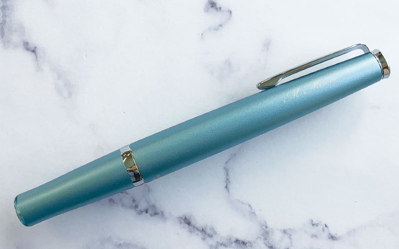 レーザー彫刻-パイロット・ブラック軸に白色筆記体印字