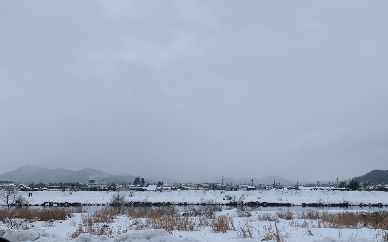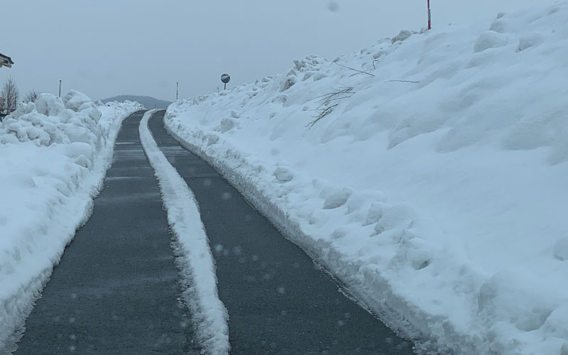 朝、自宅を出てすぐの堤防に上がる雪まみれの坂道です。
