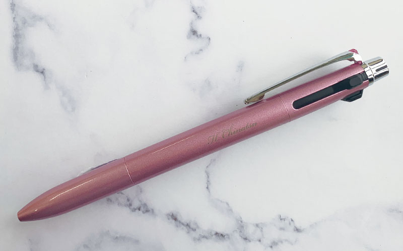 レーザー彫刻-白色筆記体印字の三菱ジェットストリーム・プライム・ライトピンク軸です。