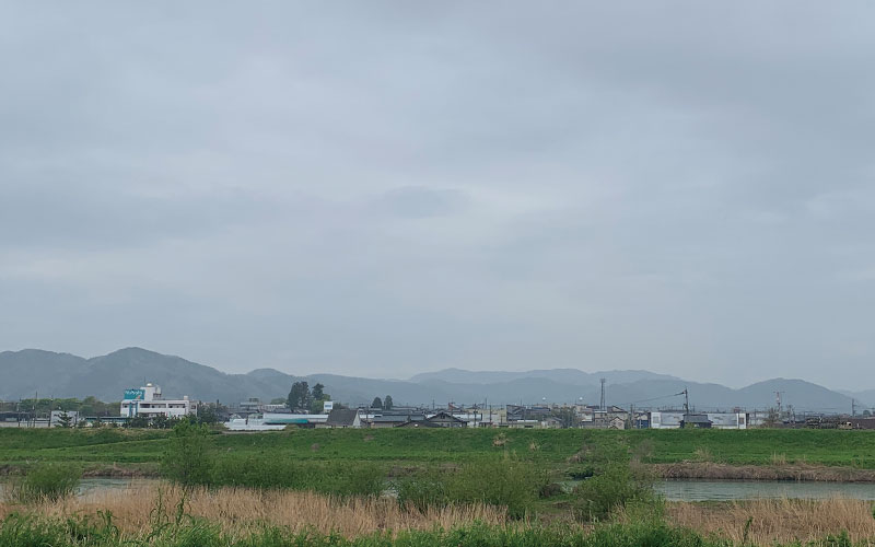 対岸の堤防に新緑が拡がる「万物創生の春」