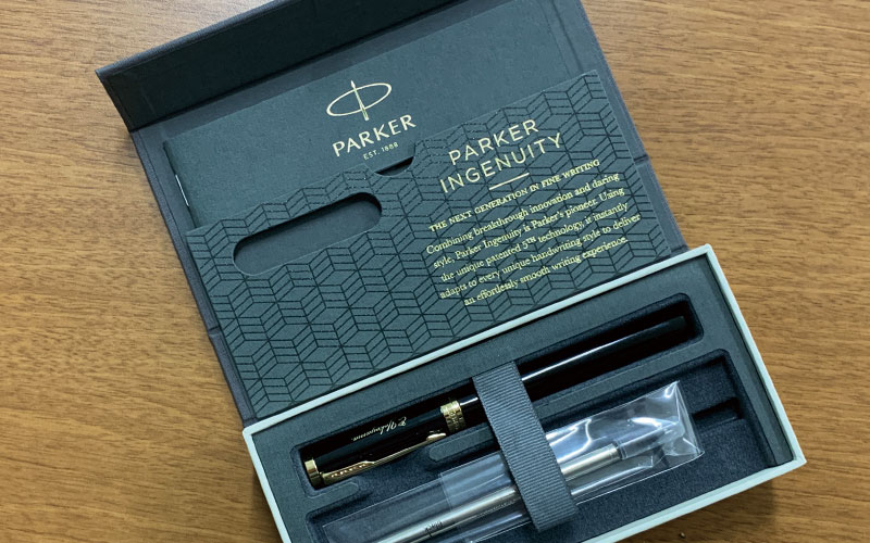 パッド印刷―パーカー・ソネットエッセンシャル・オレンジ&サンドブラストCTに黒色筆記体印刷