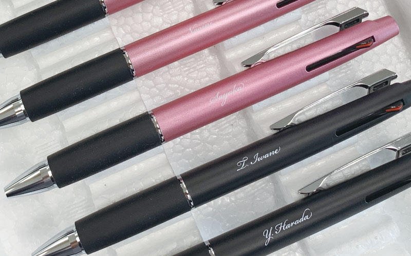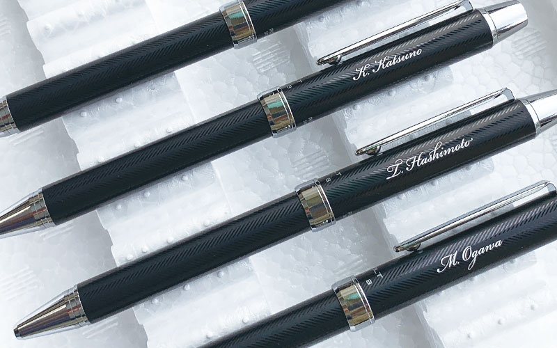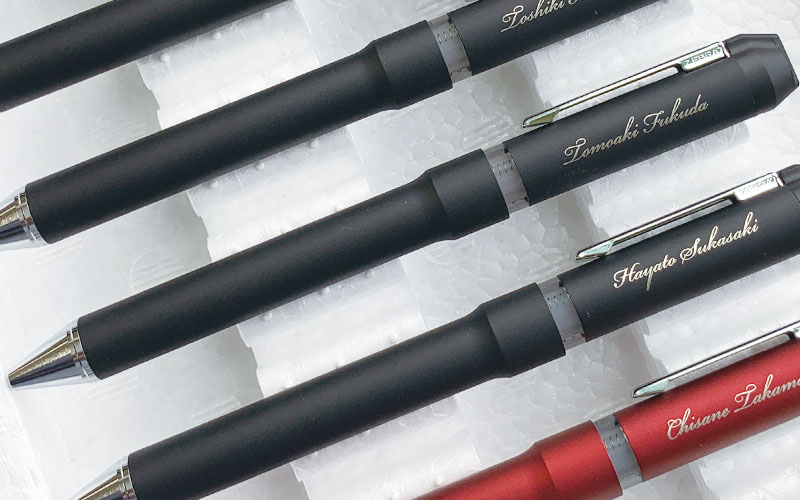 個別名入れペンをパッド印刷で:ゼブラ・シャーボnuに銀色筆記体印刷