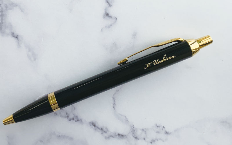 パッド印刷-銀色筆記体個人名印刷のゼブラ・フォルティア300黒軸ペンです。