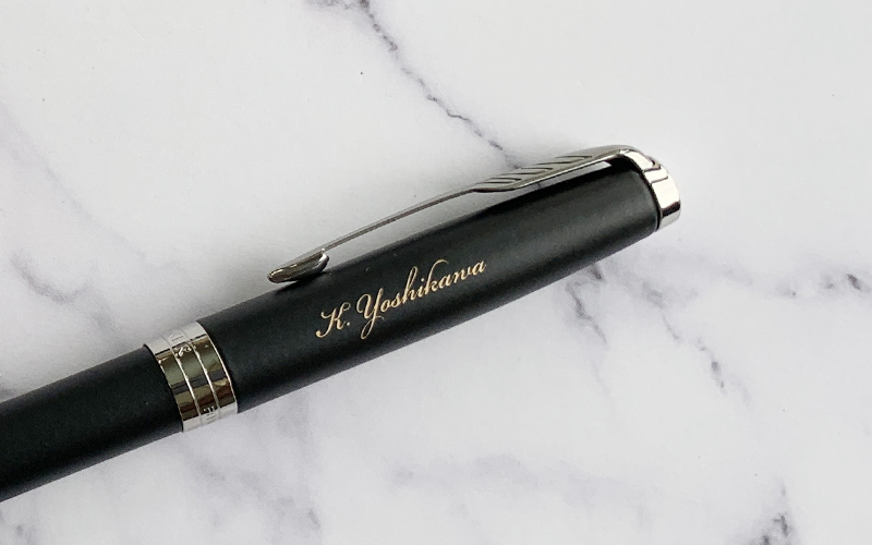 レーザー彫刻—パーカーソネットのマットブラック軸に金色筆記体印字です。