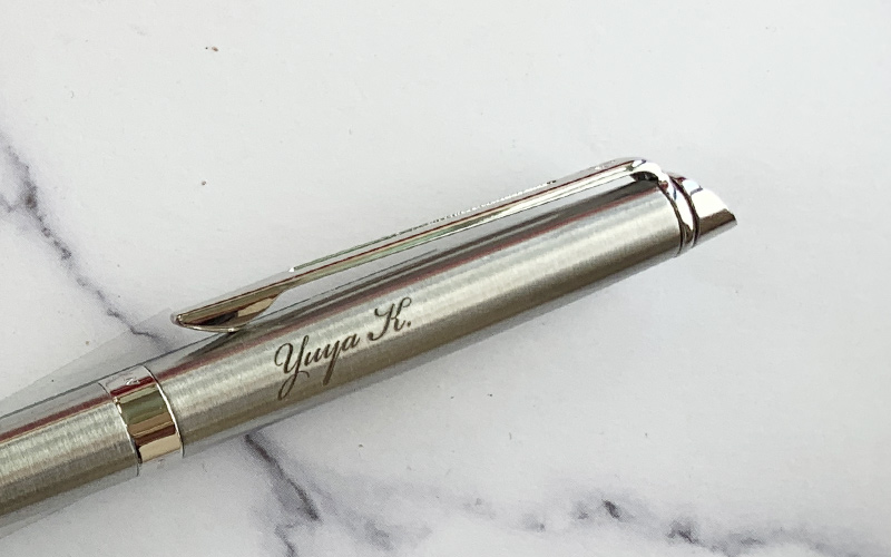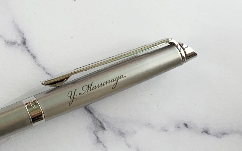 「家紋と筆記体個人名印刷」メタリック軸に黒色印刷のパッド印刷です。