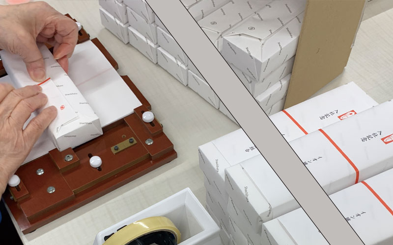 名入れペンネット考案の「のし紙貼り器」をうまく使いこなしています。