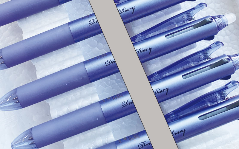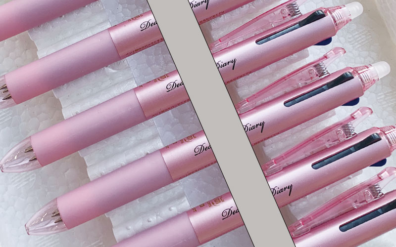白色筆記体のパッド印刷-三菱ジェットストリーム800体とピンク軸です。