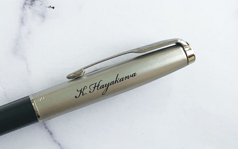 個別名入れペンの個人名印字をパッド印刷で:ゼブラ・フォルティア300を白色筆記体で