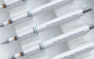 個別名入れペンをパッド印刷で:ゼブラ・シャーボnuに銀色筆記体印刷