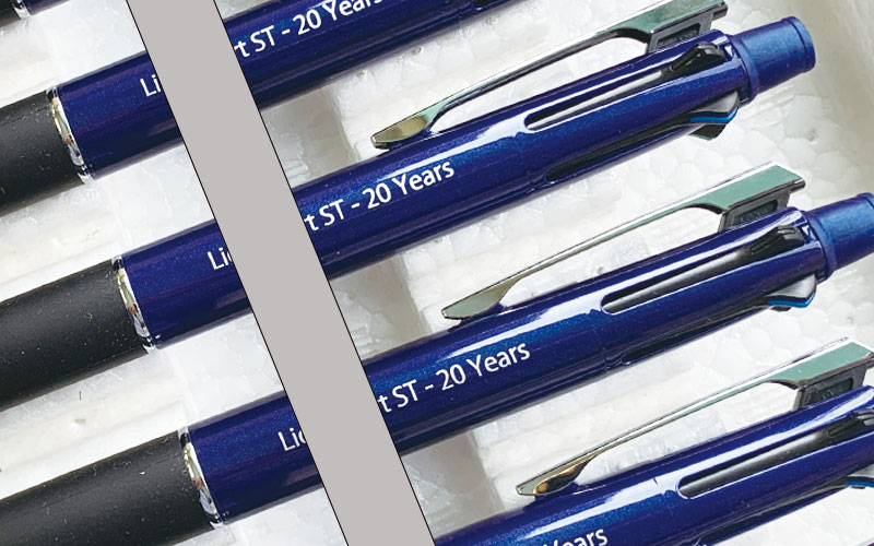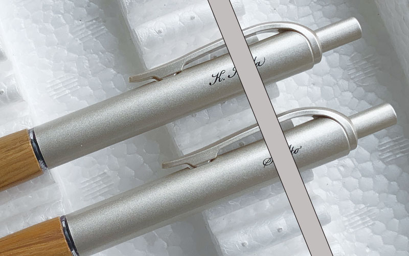 周年記念?の名入れペン:パッド印刷の銀入りゴシック体印刷です。