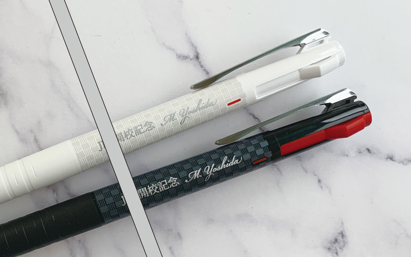 パッド印刷-三菱。ジェットストリーム2本に銀色筆記体印刷です。