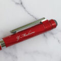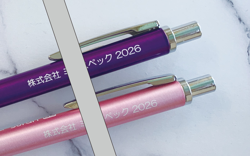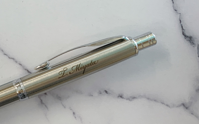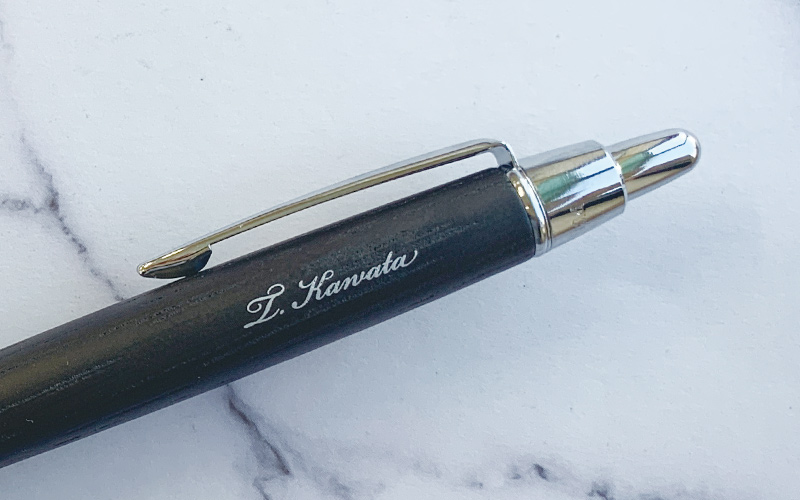 レーザー彫刻—は、ラックブラック軸の金色パーツに合わせた金色印字です。