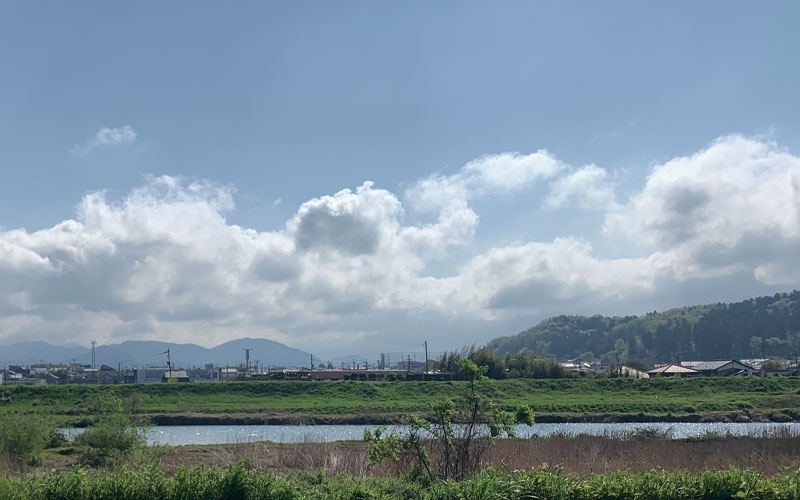 対岸の堤防に新緑が拡がる「万物創生の春」
