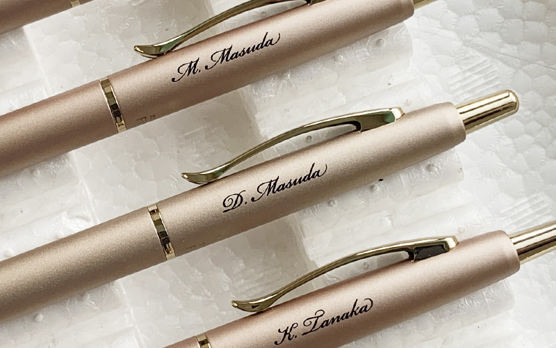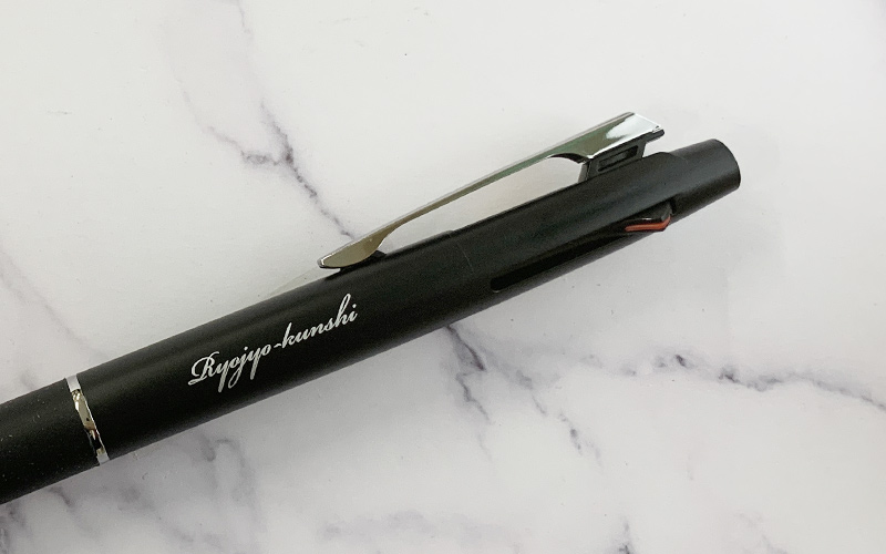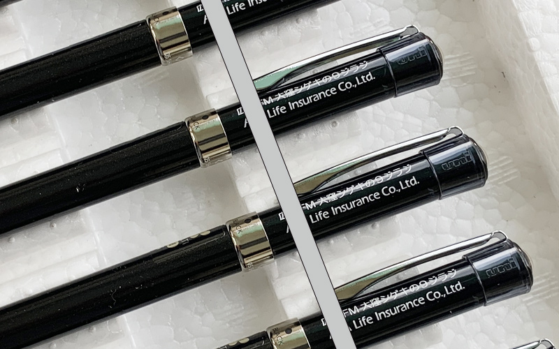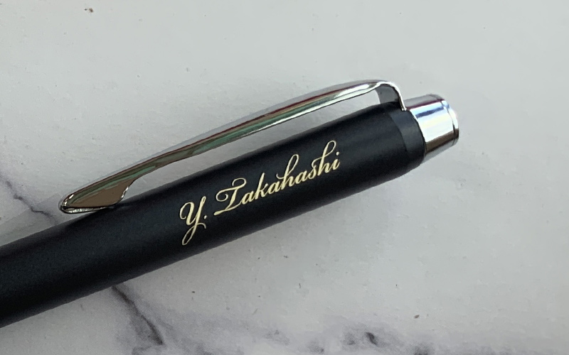 パッド印刷-ジェットストリーム800の黒軸ペンに銀色筆記体印刷です。