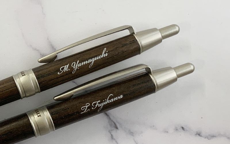 パッド印刷―天然木製ペンの銀色パーツに合わせて銀色筆記体印刷
