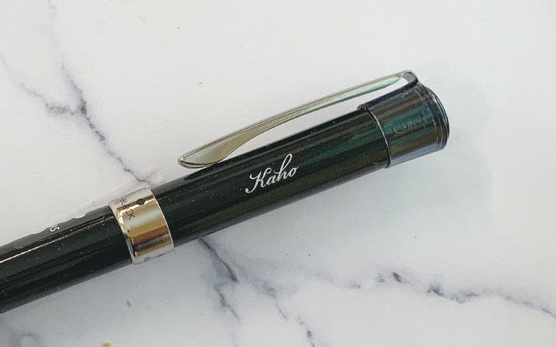 パッド印刷―三菱ジェットストリーム601ルミナスブラック軸に筆記体銀色仕上げ