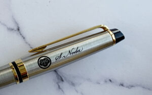 ゼブラ製 スリムボディのフォルティア300はノック式で高級感があり、ロングセラー商品です。名入れペンに、個別名入れに大変人気です。個別名入れの場合は筆記体が断然似合い、その他の書体でももちろん映えます。印字色は、シルバー軸には黒、その他の軸には金属部に合わせて「銀」がオススメです。